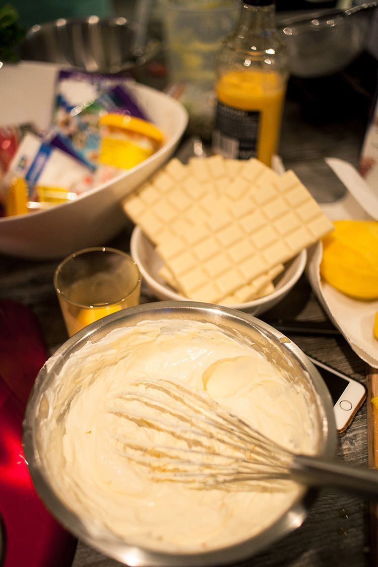 Aus dem Mascarpone und dem Speisequark schlagt ihr dann eine Creme. Währenddessen könnt ihr die weiße Schokolade schon im Wasserbad schmelzen. Hebt dann den restlichen Eierlikör unter die Mascarpone-Creme. Jetzt könnt ihr die Mangos schälen und bis auf einen Rest zum Dekorieren in kleine Würfel schneiden. Mischt sie ebenfalls unter die Creme.