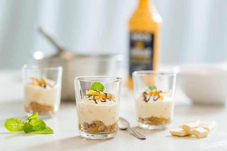 Zum Schluss zieht ihr die weiße Schokolade unter die Masse und gebt das Ganze dann auf den Cantuccini-Boden. Streicht sie etwas glatt und garniert sie mit Mango-Streifen, dunkler Kouvertüre und Minze.